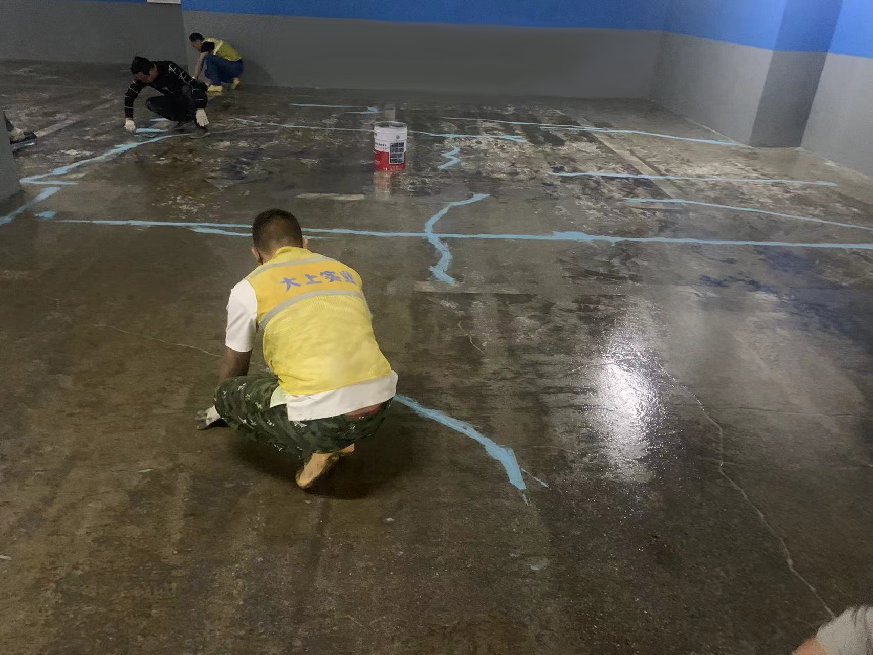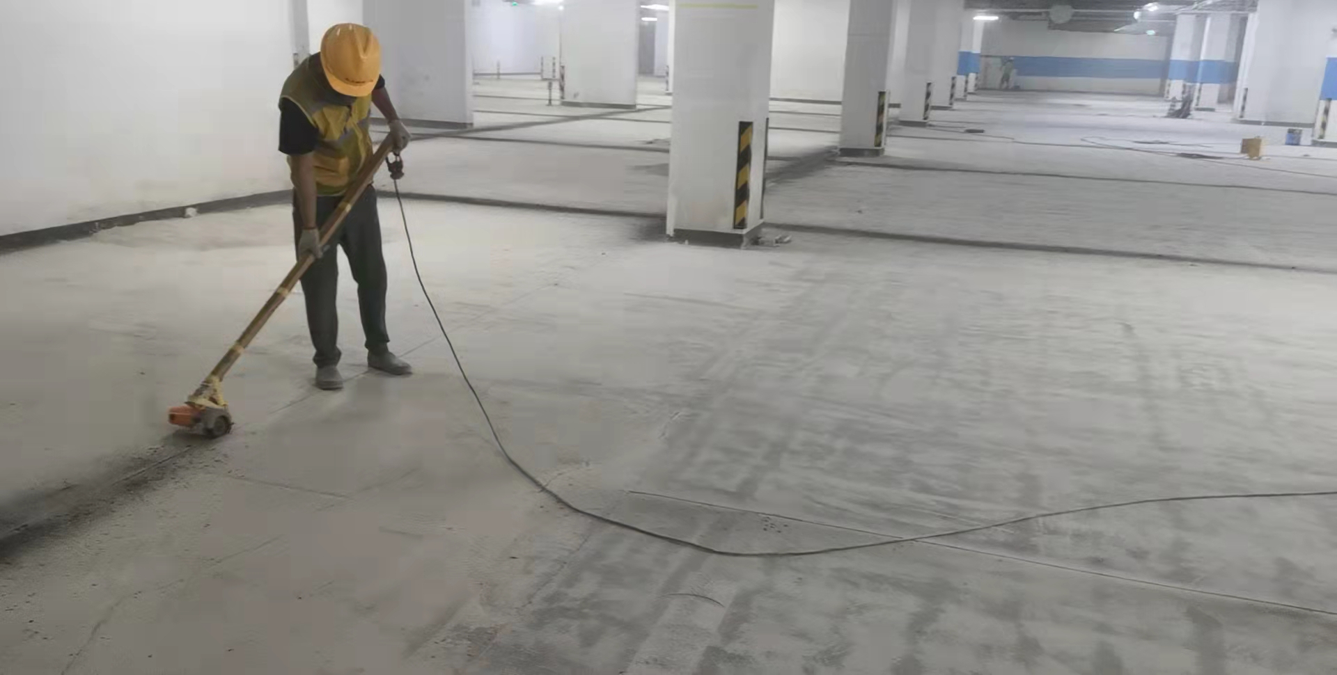 4萬多平方大型地下停車場水泥地面升級為環氧地坪地面工程,施工現場