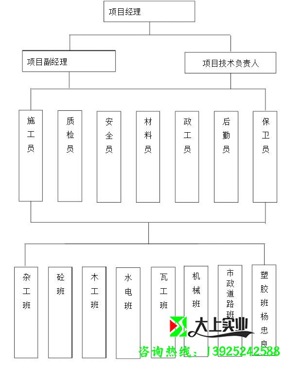 根據工程規模、特點,本工程按項目管理法施工,選派有施工管理經驗的管理人員當項目經理,挑選有施工經驗的技術人員組建項目部,組成精銳強悍的建筑隊,各司其職,各盡其能,上下協調,群策群力,精心施工,圓滿完成施工任務,施工管理機構名單詳見:施工管理機構組織網絡。